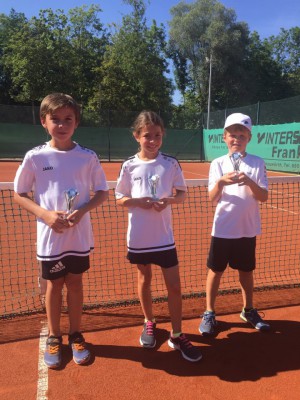 Beim Talentino-Kleinfeld-Cup in Königsbrunn gingen am letzten Samstag drei Spieler(innen) vom SV Donaumünster an den Start. Unter sieben Teilnehmerinnen konnte Sophie Schmautz in der Altersklasse U9 weiblich (Jahrgang 2010) ihr Viertelfinale erfolgreich gestalten und sich am Ende den dritten Platz sichern. Ebenfalls U9, allerdings männlich, holte sich Oscar Götz mit drei Siegen den 2. Platz. Insgesamt fünf Teilnehmer gingen hier an den Start. Perfekt abgerundet wurde das Turnier von Tonio Stirnweiß. Im Jahrgang 2011 männlich gewann er den Titel. Bei sechs Teilnehmern konnte er sich den Siegerpokal erkämpfen. Besonders stark war sein Sieg im zweiten Spiel gegen Fabian Stieglitz vom TC Augsburg, der im aktuellen Masters-Race des Bezirks Schwaben auf Postion 9 seiner Altersklasse steht.